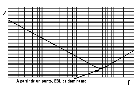 inicio ESL equivalent series inductance. Es al inductancia parásita en serie e implica que a partir de una frecuencia el condensador ya no se comporta como un condensador sino como una bobina. Se comporta como una bobina en serie con el condensador. |  |