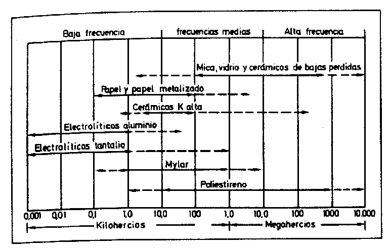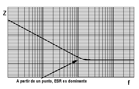 En principio un condensador de policarbonato podría serivir, pero no cumple el último punto. Un electrolítico no cumple el requisito de la baja ESL. Un cerámico Y5V cumple todo menos la gran capacidad. Por separado ninguna de las opciones es satisfactoria, pero si colocamos un electrolítico de aluminio en paralelo con cerámico de alta K habremos reunido las cuatro características. Cuando a 50kHz el electrolítico deje de comportarse como condensador, el cerámico empezará a filtrar las altas frecuencias de la alimentación. Es necesario conocer las características requeridas y sabre elegir. A la derecha se muestra una gráfica sobre la elección más adecuada de condensadore en función de la frecuencia, para circuitos de baja potencia. |  | En la de la derecha se puede observar una gráfica comparativa sobre los efectos de ESL y ESR en distintos materiales. Los que tienen parte de la gráfica horizontal quiere decir que sufren los efectos de ESR, los que tienen un pico, ESL pasa a ser dominante diréctamente. La resonancia puede ser más o menos abrupta. |  |