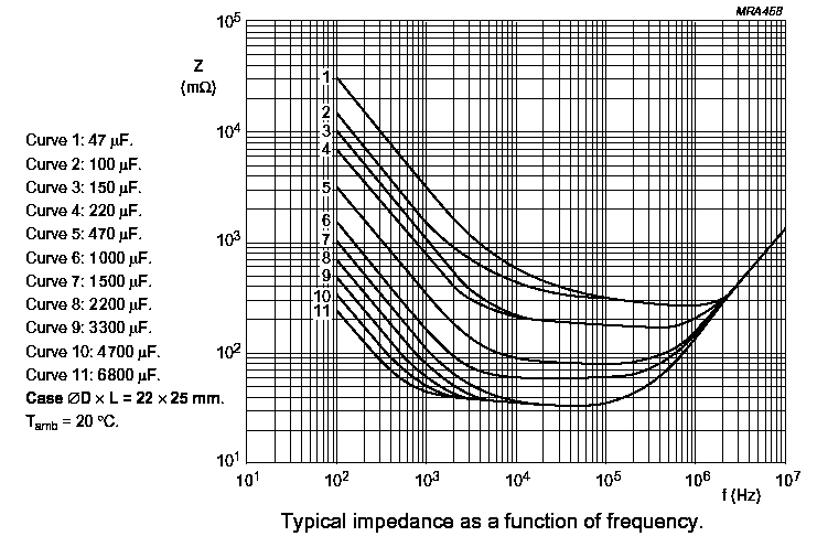 La costante dieléctrica obtenida con el óxido de aliminio es 7, con tántalo 11. El tántalo es sumamente contaminante, por lo que está en retroceso. En concreto, los electrolíticos de aluminio se pueden fabricar tamaños muy variados y con él se obtienen las mayores capacidades que se pueden encontrar. Los hay desde 1uF en una cápsula de 5mm de alto por 3.5mm de diámetro hasta condensadores de 10 faradios con el tamaño de un telescopio pequeño. Los de tántalo no suelen pasar de 100uF, pero tienen mejores características que los de aluminio. Los efectos parásitos son muy notables en ambos, ya que normalmente cuanto mayor se a la constante dieléctrica, más interaccionará con la capacidad. En los electrolíticos de aluminio, todos los parámetros son malos, exceptuando el precio y las capacidades que se pueden obtener con ellos. La obsorción dieléctrica es alta, un 1% aproximadamente (hay varios electrolitos con los que fabricar condensadores de aluminio). |  | El goteo también es alto. | Z de un electrolítico Al frente a la frecuencia | ESR es mala, depende del tamaño empleado pero puede sobrepasar 1 Ohm para tamaños pequeños (100uF a 25V). ESR aumenta respecto al voltaje máximo permitido. Habitualmente se podría reducir si se usasen varios iguales en paralelo. La constante dieléctrica disminuye en función de la frecuencia, también varía con la temperatura, y con el tiempo de secan y no funcionan correctamente. Ningún electrolítico está garantizado para durar más de 10 años. |  | | | K de un electrolítico Al frente a la frecuencia |