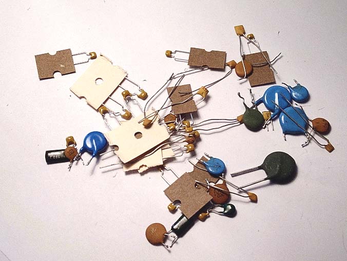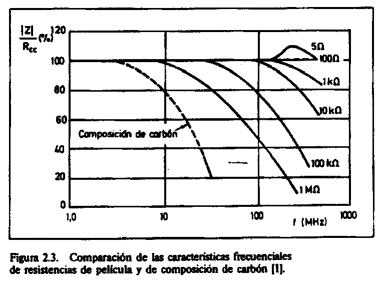 EFECTOS PARÁSITOS EN COMPONENTES PASIVOS IntroducciónNormalmente se estudian los componentes como si fuesen elementos ideales que soportan potencias, corrientes y voltajes infinitos. En textos básicos de física es común ver capacidades de varios Faradios, resistencias de 1 Ohm, corrientes de 10 A, inductancias de varios Henrios.... valores que de por sí son muy lejanos al mundo real, pero que son necesarios para no complicar con cálculos inútiles y cientos de ceros la adquisición de conocimientos y estrategias. Una primera aproximación al mundo real es la inclusión de la potencia, trabajar con potencias reales (ahora las resistencias soportan máximo 1W en vez de 100) supone la desaparición de los Faradios y los ohmios, y empezamos con los kOhm y los uF, ya más cercanos a lo que se puede adquirir en la tienda. A medida que se especializa el diseño, y se pretende sacar el máximo rendimiento a un circuito, dbemos tener en cuenta que los componentes reales no se comportan como componentes ideales, tienen trabas en su funcionamiento que los alejan del comportamiento esperado. Por ejemplo, el ejemplo más obvio y cercano es el caso de los componentes para filtros pasivos: Al sustituir un electrolítico bipolar en un tweeter por un condensador MKP mejoran espectacularmente los agudos y los cambios son perfectamente medibles. Es un fenómeno llamado inductancia serie equivalente, y hace que a partir de una frecuencia el condensador se comporte como una bobina ¿? Todo tiene su explicación. inicio ResistenciasExisten cuatro tipos básicos de resistencias: composición de carbón, hilo bobinado, film metálico o film de carbón y resistencias metal-óxido. Los demás (thick film, bulk metal foil, metal cistalizado...) son variantes Para empezar, el primer efecto parásito está causado por las patas. El hilo crea alrededor de sí mismo un campo magnético (experimento de Oersted), y a muy alta frecuencia se manifiesta como una inductancia. Tanto es así que para un hilo de cobre de 10cm, tenemos 10nH. Afortunadamente estos valores no son importantes en las frecuencias a las que nos movemos, aunque sí lo sean en el diseño de la electrónica previa. Otro efecto parásito que no es para nada obvio, aunque bastante más leve, es la modulación térmica de la resistencia. Habitualmente, la resistencia aumenta con la temperatura, y la disipación de potencia puede no ser suficiente. Por eso, a medida que nos aproximamos al límite de disipación térmica, la temperatura aumenta y la resistencia también. Si superamos ese valor, es muy posible que se puedan producir variaciones permanentes. Estas variaciones dependen del material y el carbón es siempre el que más variación térmica tiene. inicio Composición de carbónLas resistencias de composición de carbón consisten en una pasta hecha a base de carbón y algún metal conductor, que se solidifica en forma de barritas y luego se corta, dando así la resistencai deseada. Existe una variante, el Cermet, usado principalmente en potenciómetros de potencia (10W), que en vez de carbón usan cerámica y metal. |  |
