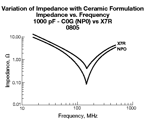 inicio NP0,CG0.Son cerámicas muy estables, de baja constante dieléctrica (alrededor de 5) por lo que no es posible obtener grandes valores de capacidad, m´ximo 10nF, El dieléctrico utiliza entre otros Neodimio y Samario. Son muy estables con la temperatura ya que suelen estar formados por dos materiales, uno de ellos con coeficiente térmico negativo y otro con coeficiente térmico positivo. Asi se compensan y el resultado es muy cercano a cero, en todo caso mejor que en los polímeros. Se pueden obtener tolerancias muy bajas, de un 5% o menos para capacidades del orden de picofaradios, y pueden soportar voltajes de hasta 3000V. Son adecuados para circuitos temporizadores y filtros, su absorción dieléctrica está alrededor del 0,01%, un valor semejante a la mica. Su estabilidad temporal también es envidiable, la variación no supera el 0,1% |  | | | Z del NP0 y del X7R |