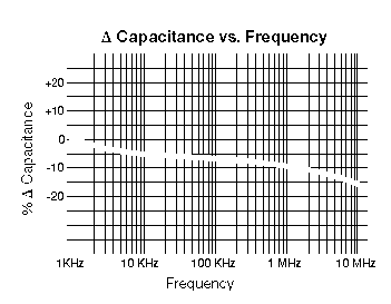 inicio X7REs un material intermedio entre las cerámicas de baja K y las de alta K. La capacidad no es constante frente a la frecuencia ni tampoco frente al voltaje. Aún así las variaciones netran dentro de un 15% en todo el rango de temperaturas. Su uso es bloqueo de DC y en general aplicaciones que no requieran una gran constancia en la capcidad, pero si baja ESR y ESL, y tamaño. |  | | | K del X7R frente a f |
