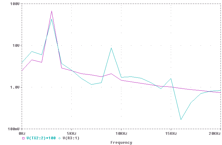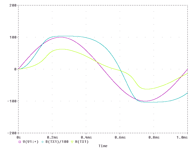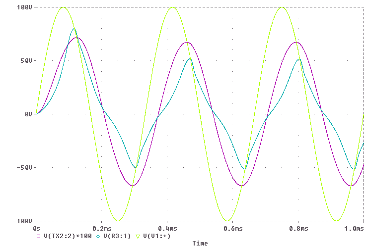 | Y ahora en el dominio del los voltios y los amperios, vemos el efecto que sufiría nuestro altavoz. La onda azul claro es la que más distorsionada está, como se puede pareciar a simple vista. Sus síntomas son la consecuencia de B. La saturación del núcleo hace que esté "pasando" un pico en la onda que no debería pasar, ya que al estar saturada, la bobina no funciona como tal y permite el paso de alta frecuecnia. Los efectos de la remanencia no son visibles. En cambio, la otra onda en granate, con una corriente 100 veces menos no llega a saturar el núcleo. Su forma es la de un senoide, con el desfase que produce el filtrado, 30º aproximadamente.