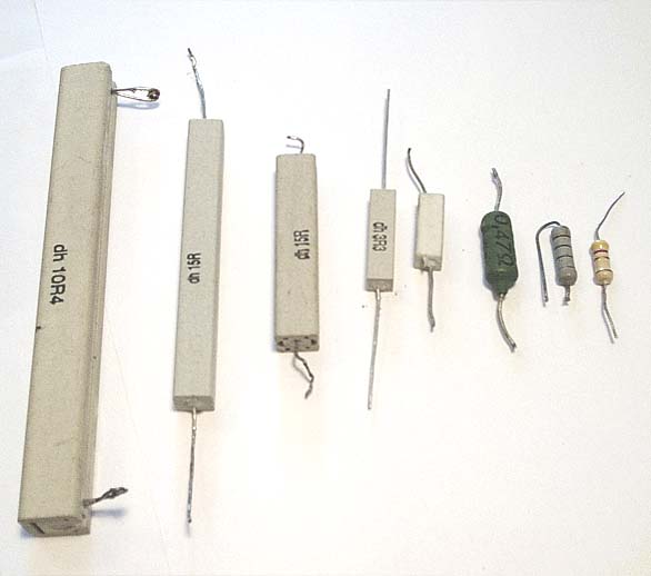 Sus efectos parásitos son principalmente capacitivos como se puede ver en la gráfica, aunque mucho menores que las de composición de carbón, pero aún así siguen siendo notables a muy alta frecuencia. Su modelo equivalente es el mismo que las de composición, pero cambian los valores de capacidad parásita. inicio Hilo bobinadoLas resistencias de hilo bobinado son la opción por excelencia para potencia. He llegado a imponer un consumo de 100W a una resistencia de potencia nominal 5W sin que se produjese un fallo, durante unos pocos segundos. Principalmente, la limitación de potencia en este tipo de resistencia viene marcado por la temperatura y en todo caso por la precisión que deseemos. El aumento de la temperatura producirá otro aumento de la resistencia. El otro problema derivado es que la disipación de potencia se hace en forma de calor, en primer lugar puede fundir el estaño que suelda la resistencia, y en segundo lugar puede quemar los componentes que hay alrededor. |  | Se construyen a base de un hilo resistivo muy largo. Ese hilo, lógicamente, no está en posición recta, está en forma de espiral ya que es una forma más eficiente de utilizar más longitud en un mismo espacio, sin tener que utilizar resistencas de un palmo de longitud. |  | | | Modelo equivalente |